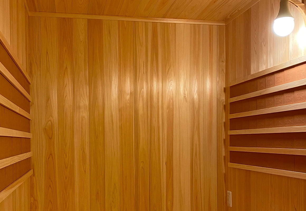三朝温泉の源である、岡山県・人形峠のラジウム鉱石を原材料として製造された素焼きタイル「ドールストーン」を敷き詰めた、檜の香るお部屋でワンちゃんと一緒にリラックスしておくつろぎいただけます。