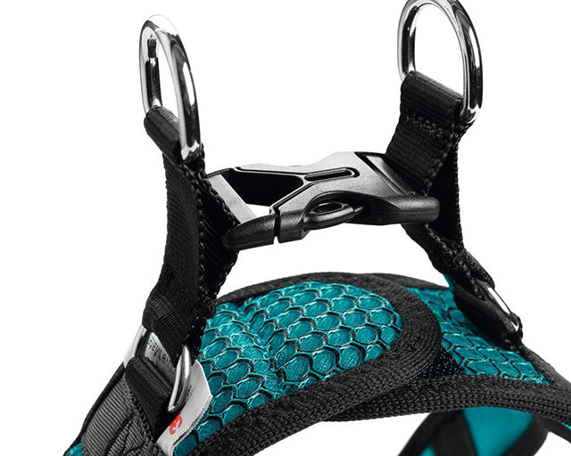 また、ハーネスと2つのアタッチメントリングの間に設けられた可動部により、犬の引く力がハーネス全体に分散され、バックルへの負荷が軽減されます。