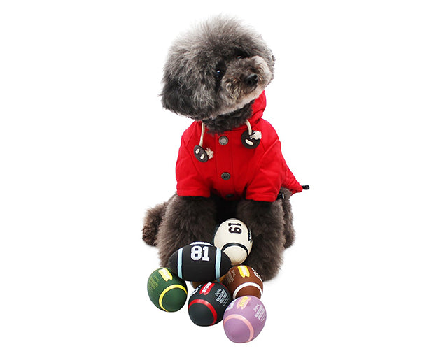 アメフトのボールをデザインしたお洒落なラテックストイ。変則的な転がり方で、ワンちゃんも大興奮です。