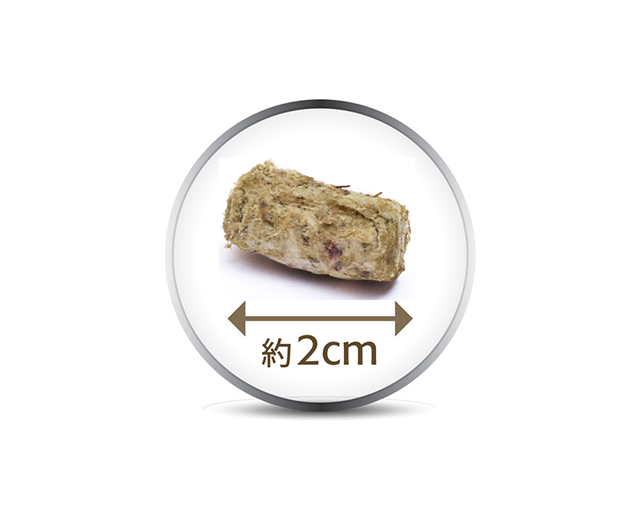 また、一般的なドライフードのように、肉食動物である犬や猫にとって不要な、穀類・イモ類・豆類などの、粘性の高い、ツナギや量増しとしての原材料を一切、使用していないため、1粒1粒が柔らかく、簡単に、ほぐせるようになっています。