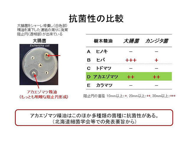 アカエゾマツは北海道東部の針葉樹林で、アイヌの人々に「女神の木」と呼ばれています。香りがとても良く、抽出した精油には「皮膚の炎症改善、抗菌、リラックス作用」など数多くの効果が認められています。