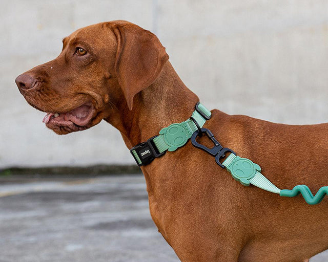 こちらはシンプルにワントーンで仕上げたアーミーグリーンに艶消しブラックの金具。あらゆる毛色のワンちゃんに似合います。