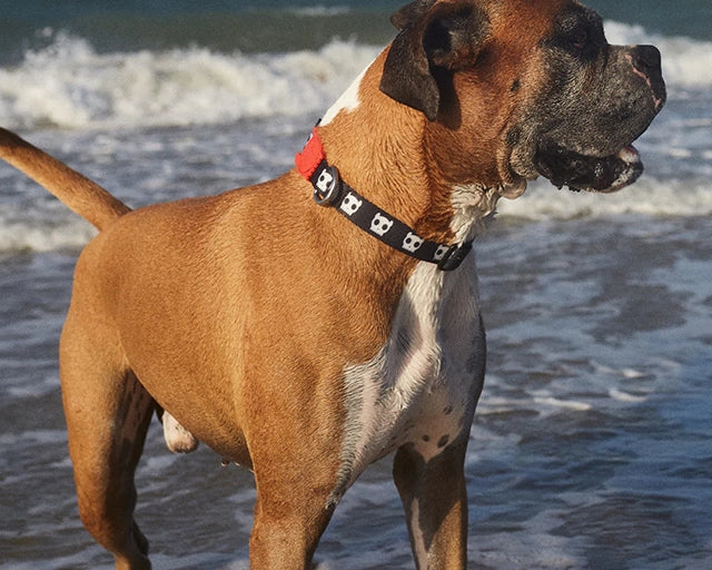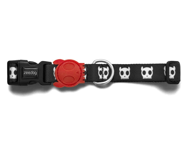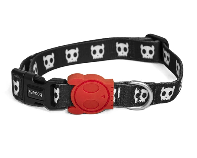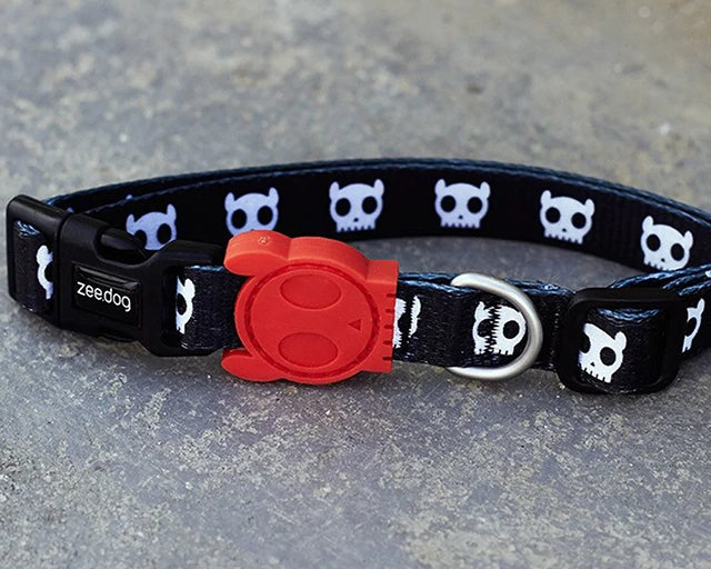 こちらはブラックのテープに並んだコミカルなスカルがカッコ可愛いスカルカラー。 ラバー製のかわいいスカルがポイント。お揃いのリードもございます。