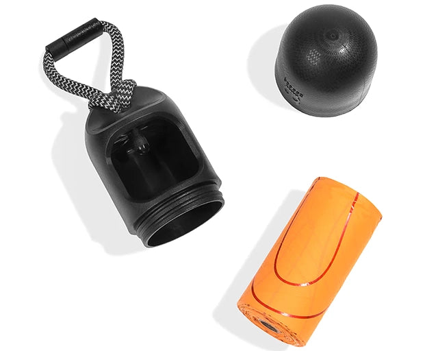 オシャレな黒いカプセルの中にカラフルなオレンジのバッグをセットしました。